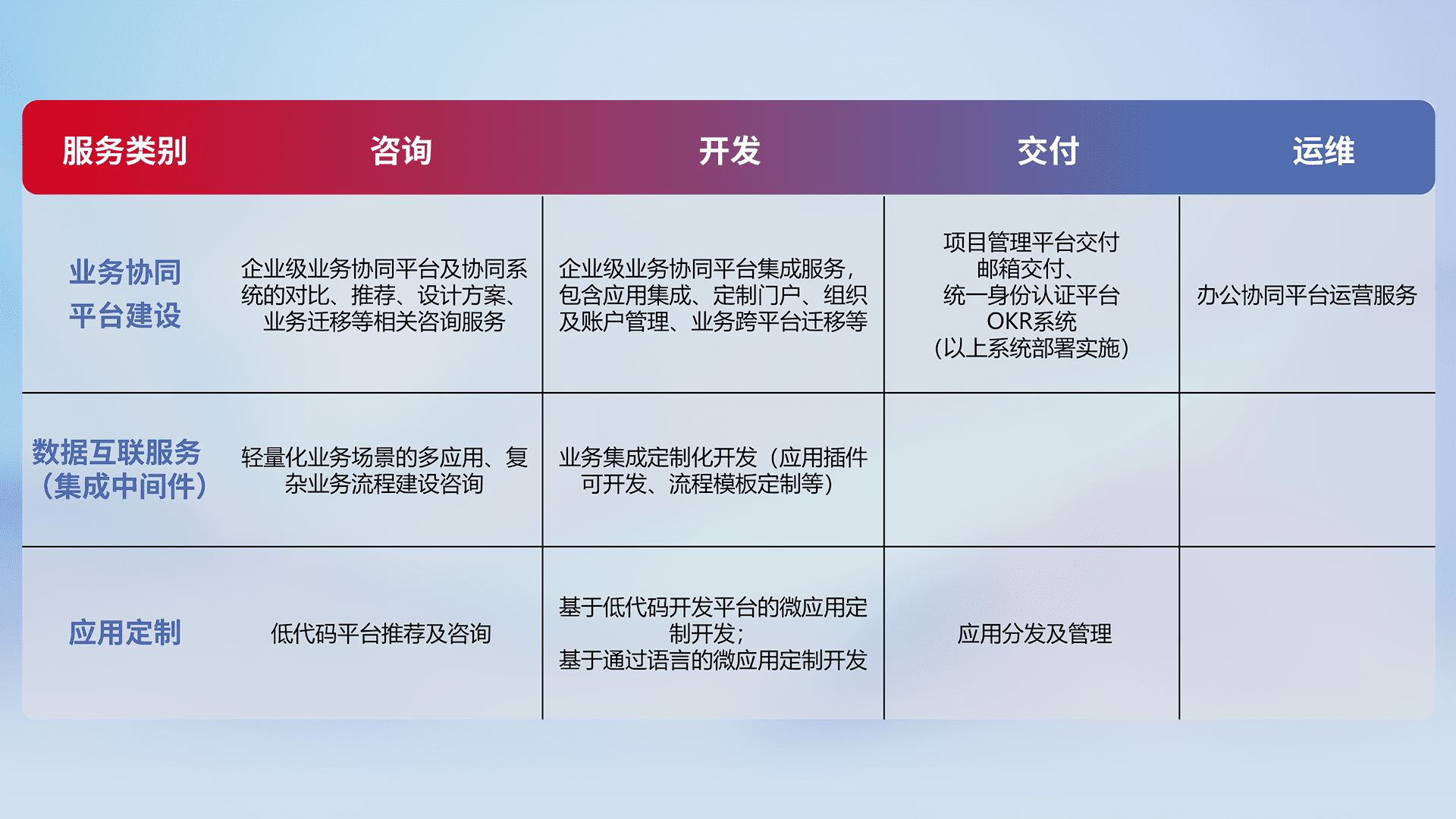 针对钉钉、、企微、、、、IDaas等平台级产品提供产品的规划、、、方案、、、交付、、定制化开发等服务,,,实现如统一协同办公、、、、智能客户服务、、、混合会议管理、、、、智能数据查询、、、等业务场景,,,,实现数字化转型。。。。