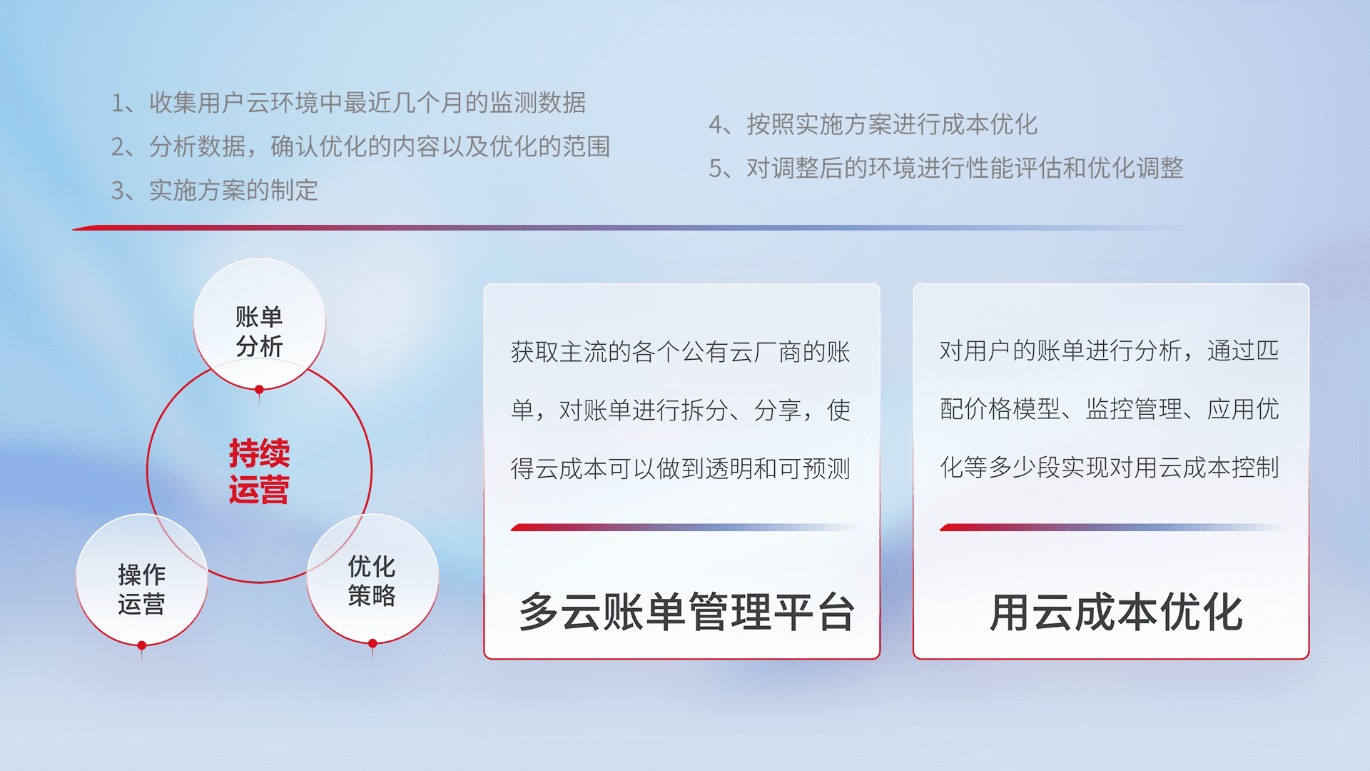 通过多云纳管,,以统一的资源数据模型把客户的云资源进行抽象和封装,,,,进而实现对多云资源的统一操作,,保障云资源管理的可靠性、、、稳定性与可用性。。量身定制化运维内容,,配置、、、、开发运维、、、补丁管理、、备份、、、、监控、、、认证和访问管理、、、审计和日常巡检等,,保障在用云过程中的可靠度,,稳定度以及高可用率。。。。